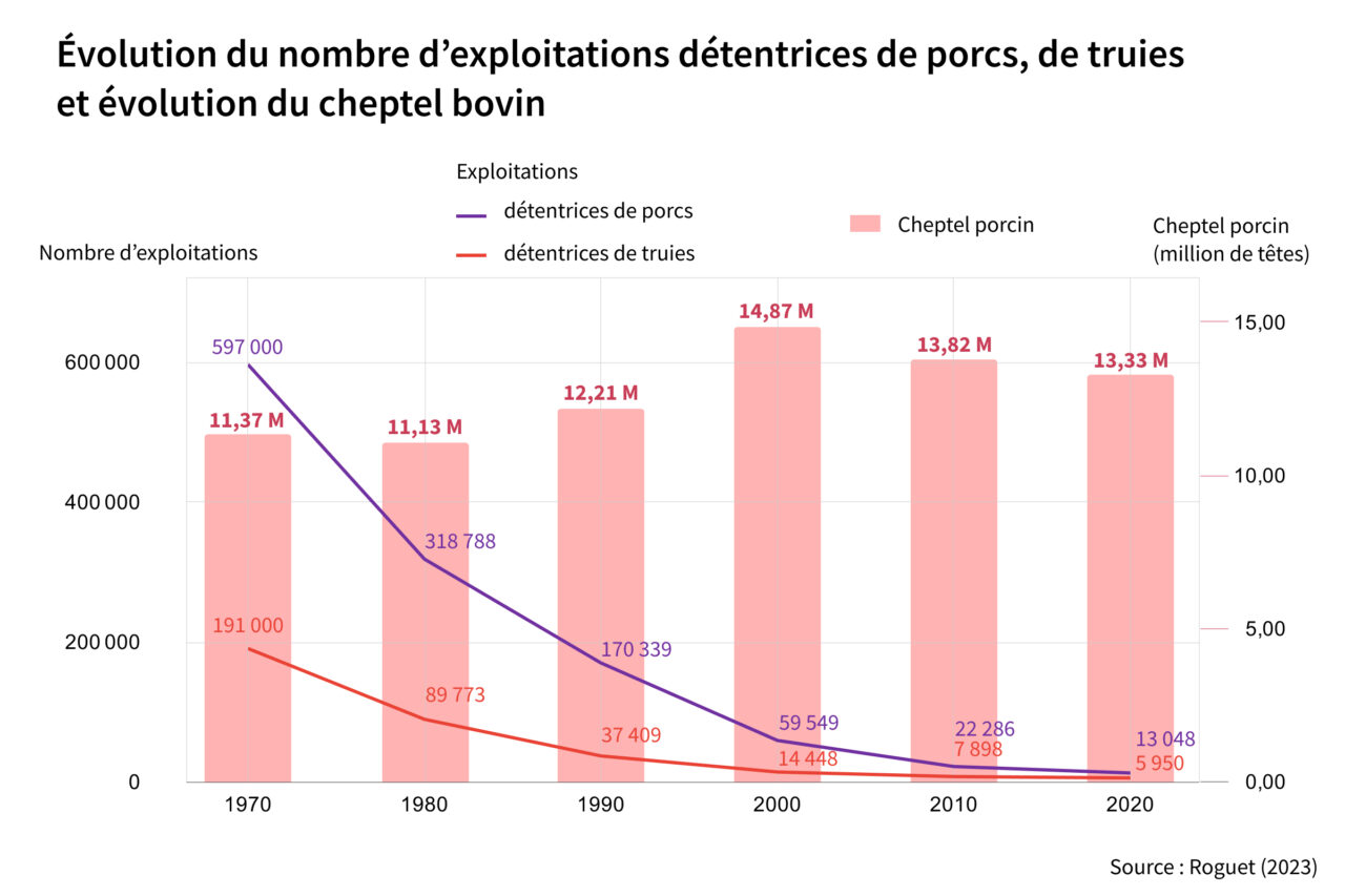 La filière porcine s’est métamorphosée depuis les années 1960. Les volumes et les cadences de production ont augmenté, le nombre d’acteurs s’est réduit via un phénomène de concentration qui a engendré des structures de grande, voire de très grande taille, avec un nombre croissant d’exploitations de plus de 2 000 porcs.