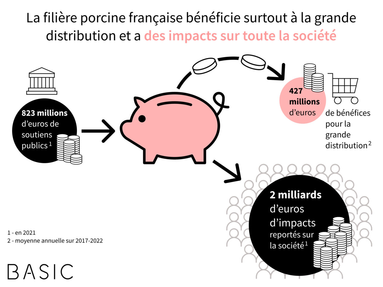 Les pouvoirs publics (État, Union européenne, etc.) ont dépensé 823 millions d’euros en 2021 pour soutenir les différents maillons de la filière porcine. Il s’agit principalement de subventions d’exploitation pour les éleveurs et les éleveuses et d’exonérations sociales et fiscales pour tous les maillons (production, transformation, distribution, restauration).