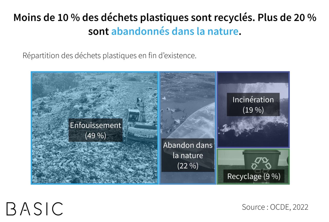 Largement présent également dans le secteur de la construction, des transports ou du textile (polyester, par exemple), le plastique a de multiples impacts écologiques négatifs, qu’il termine sa vie incinéré ou, pire encore, enfoui dans le sol ou abandonné dans la nature. La part des déchets plastiques qui finissent dans la nature atteint 22%, selon une étude publiée en 2022 par l’OCDE.