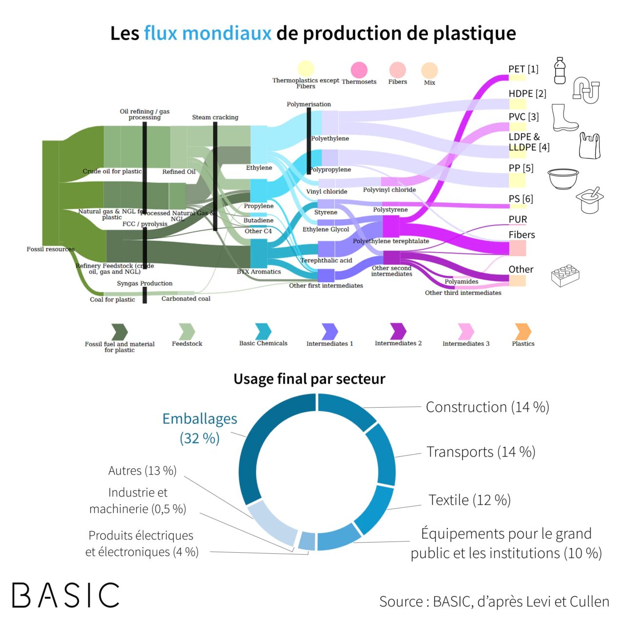 Dans une étude réalisée en 2024 et 2025 que nous publions aujourd’hui pour la première fois, le BASIC a modélisé le métabolisme des matières plastiques au niveau mondial, de l’extraction de pétrole à leur usage dans les différents secteurs économiques. Elle montre que près d’un tiers ont pour usage final les emballages.